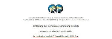 ©2025 Tagesordnung der GeneralversammlungGeneralversammlung des ISGAm 26.März 2025 sind alle Vereinsmitglieder zur Generalversammlung in den Lendhafen, Lendkai 17, geladen.