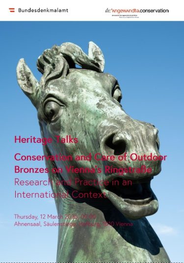 Die Veranstaltung widmet sich der Erhaltung und Pflege von Bronzeplastiken entlang der Wiener Ringstraße aus nationaler und internationaler Perspektive. Vorgestellt werden aktuelle Ergebnisse einer Evaluierung ausgewählter Objekte mit Fokus auf deren Erhaltungszustand sowie auf die zuletzt durchgeführten konservatorischen und restauratorischen Maßnahmen.