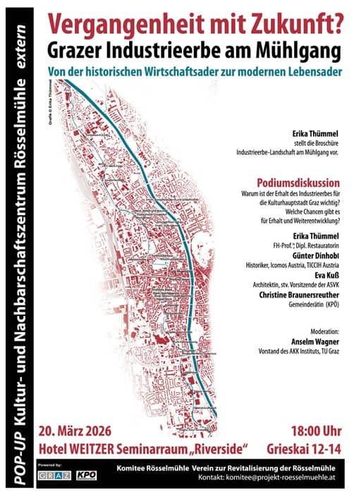 Entlang des Grazer Mühlgangs lässt sich – noch – ein zusammenhängendes Areal historischer Industrie- und Gewerbebauten erleben. Was für die Menschen der Murvorstadt Identität und Lebensqualität bedeutet, ist für die Stadt Graz eine einzigartige Ressource. Dazu erfahren Sie in der Vorstellung der Broschüre und der anschließenden Diskussion mehr.